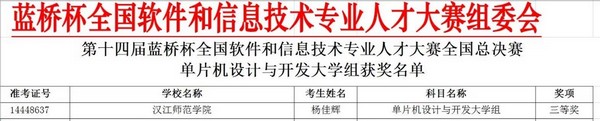 日前,第十四届“蓝桥杯”大赛全国总决赛成绩揭晓,KY开元集团官网杨佳辉同学喜获电子类(单片机设计与开发大学组)三等奖的好成绩。