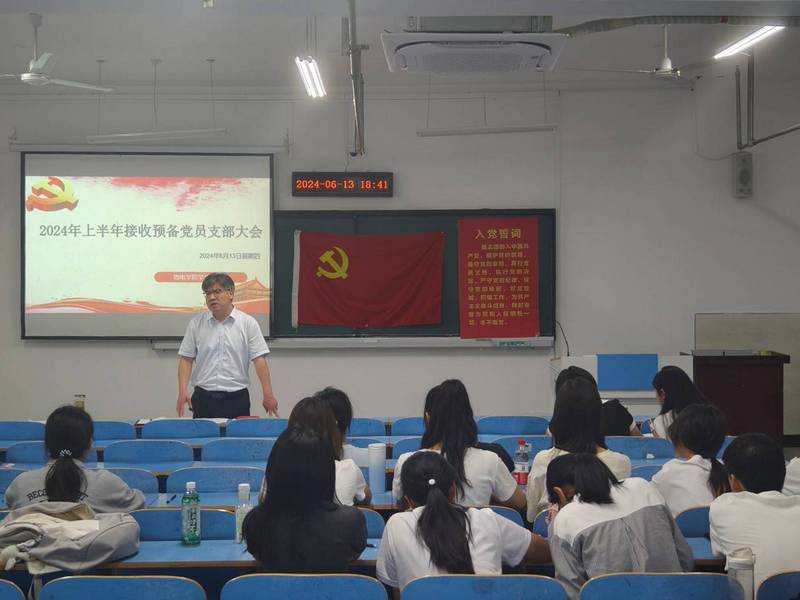 6月13日下午,KY开元集团官网2024年上半年预备党员接收大会在崇文楼B805召开,就接收胡蓉等12名发展对象为预备党员事宜进行讨论与表决。学生党支部全体党员和入党介绍人参加会议,会议由学生党支部书记王超然主持。