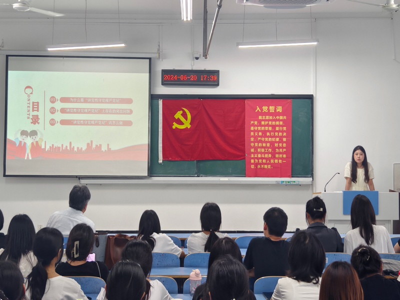 6月20日下午,教工党支部书记周鹏、学生党支部书记王超然分别为师生党员讲授专题党课。党课聚焦“六大纪律”,要求全体党员始终牢记党的纪律是刚性约束,守好纪法“总开关”,牢牢守住底线红线,党员老师要严守师德,教书育人,学生党员要模范遵守校纪校规,发挥模范带头作用。