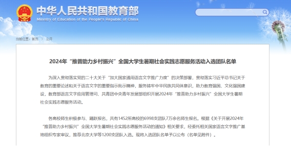 近日,教育部发布《2024年“推普助力乡村振兴”全国大学生暑期社会实践志愿服务活动入选团队名单》,开元集团官网“藏区推普实践小分队”成功入选。